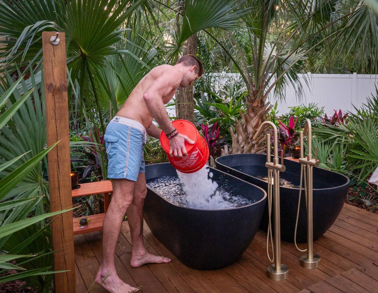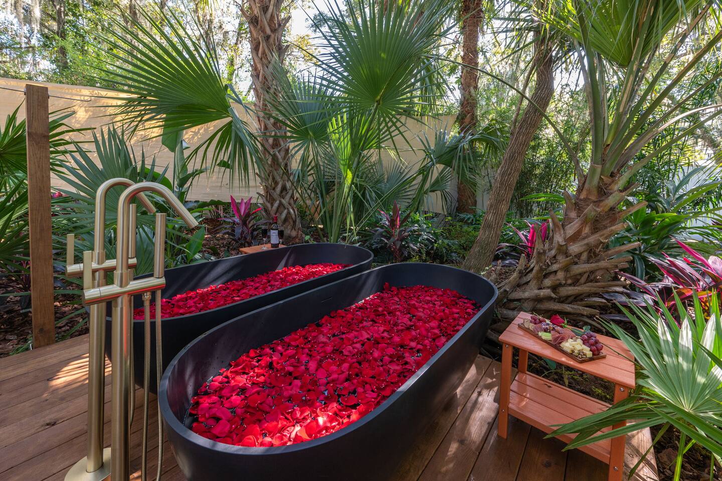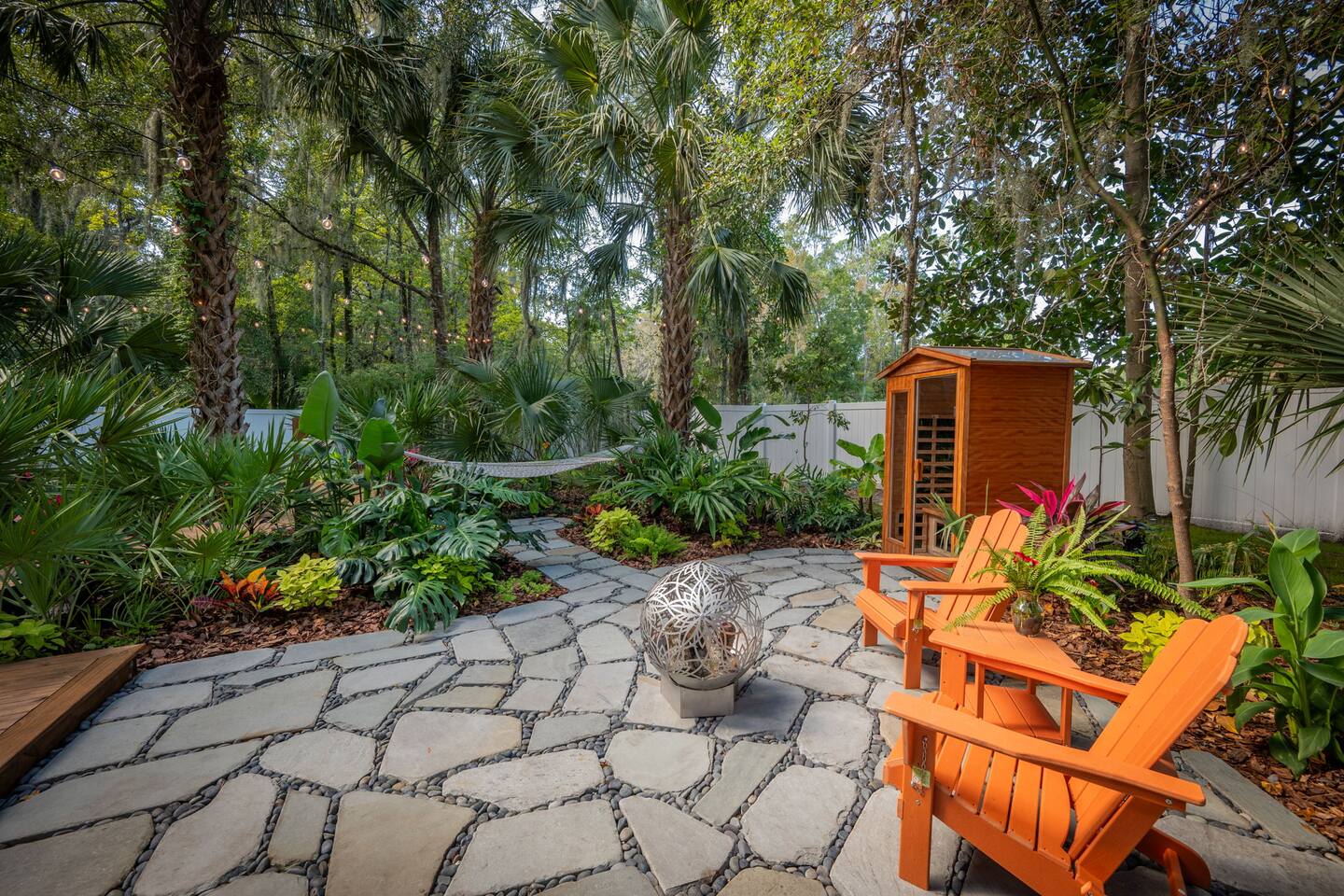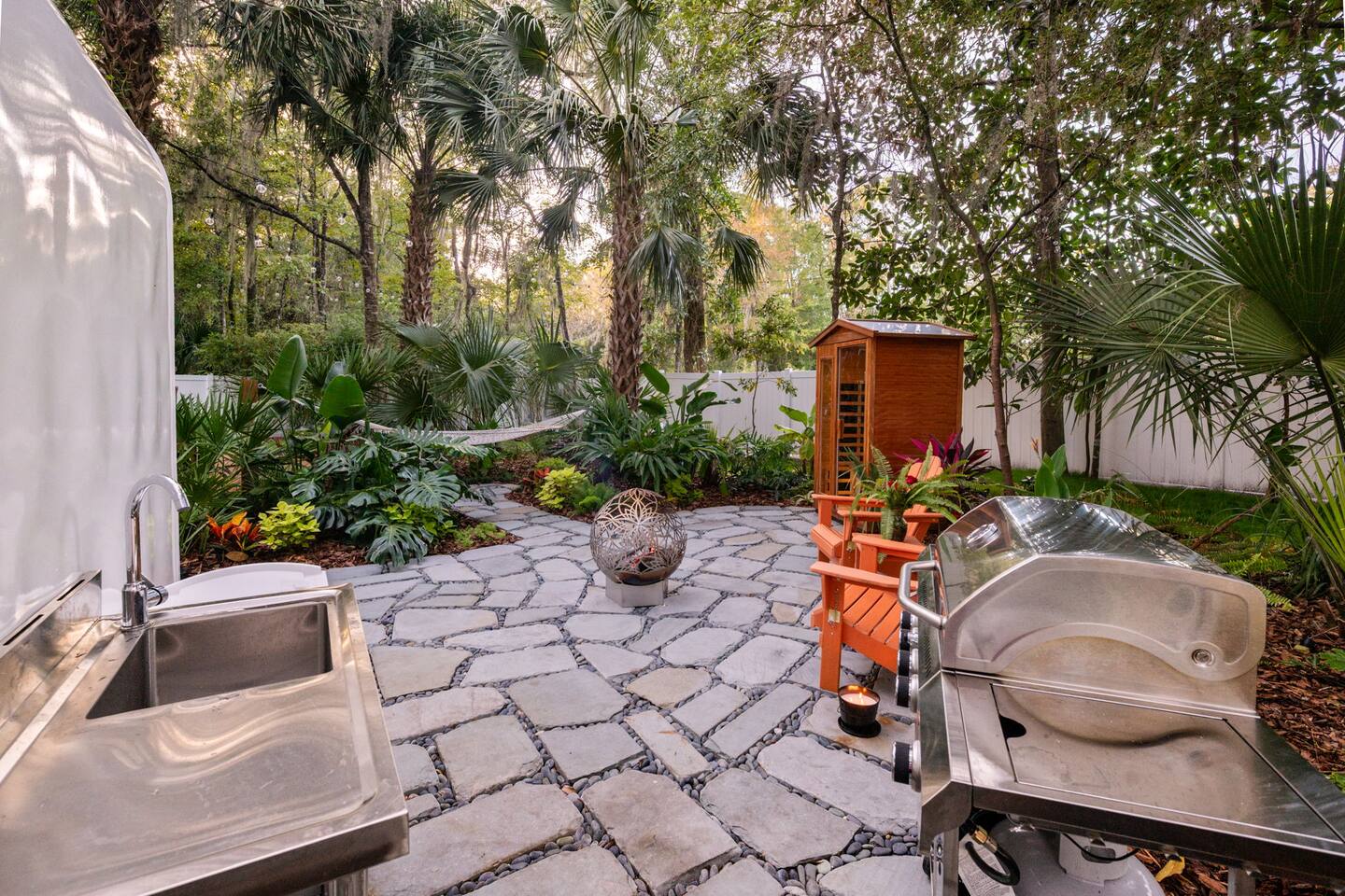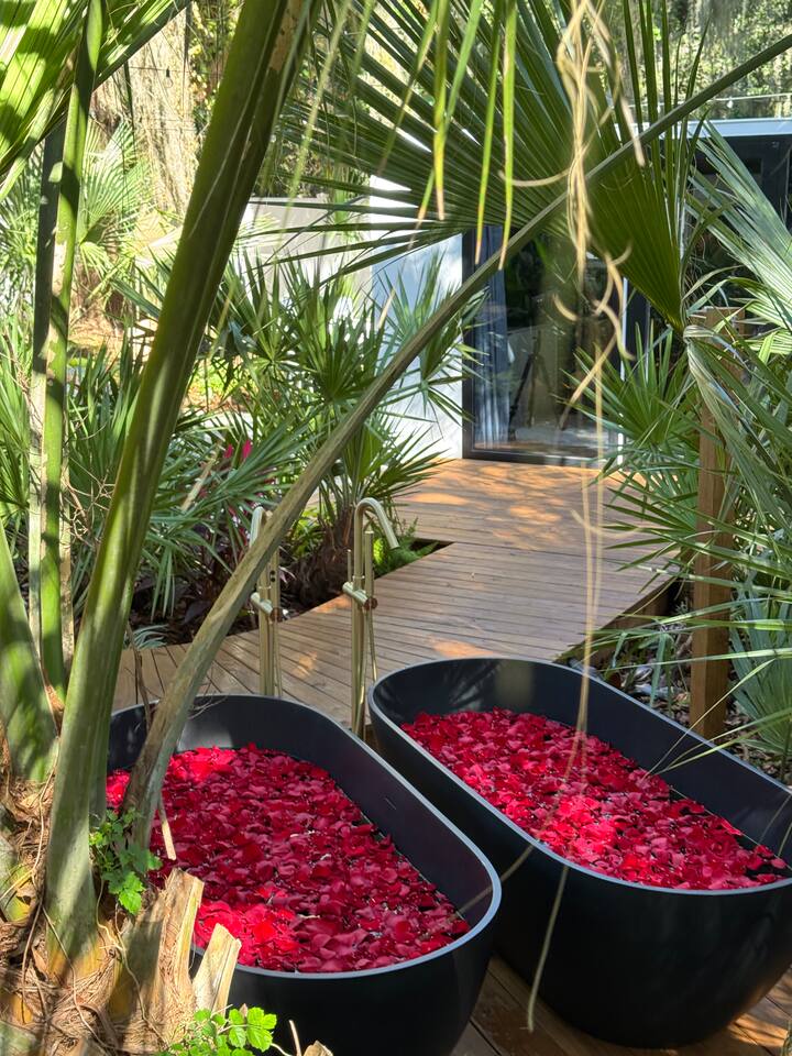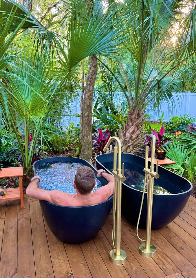 ✨ The Experience Immerse yourself in romance and relaxation beneath the stars. Enjoy two oversized outdoor soaking tubs, perfect for a hot soak or invigorating cold plunge—enhanced by a professional icemaker for wellness enthusiasts. Unwind in the private infrared sauna featuring mood lighting and a built-in sound system, or cozy up by the outdoor fire pit with a glass of wine. 🌹Deluxe Rose Package (Optional Upgrade) Please note that the rose petals and romantic rose setup you may have seen in photos or videos are not included with the nightly rate. If you’d like to elevate your stay with our Deluxe Rose Package, just let us know! We’ll be happy to add it to your reservation. Every detail is designed for connection and serenity—from plush Turkish cotton robes to romantic string lights illuminating the tropical garden. 🛏️ Inside Your Tiny Luxury Retreat Step into a beautifully designed modern interior featuring: • A cozy queen bed with luxury linens • Smart TV & Wi-Fi for streaming your favorite shows • Fully equipped kitchenette with coffee, tea, and snacks 💞 Perfect For • Romantic getaways & anniversaries • Newlyweds seeking privacy and luxury • Wellness-focused couples looking to recharge • Special occasion surprises or weekend escapes 🔑 Highlights • Two outdoor soaking tubs for hot or cold therapy • Private sauna with lights & sound system • Outdoor fire pit, hammock, & café table • Plush Turkish cotton robes for spa-like comfort • Romantic lighting & tropical garden setting • 8 minutes to Downtown St. Augustine 🍳 Your Culinary Setup: Indoor Kitchenette & Outdoor Grill You’ll have two convenient areas to accommodate all your culinary needs during your stay in Saint Augustine! The Indoor Kitchenette Our cozy indoor kitchenette is fully equipped for quick meals, snacks, and gourmet coffee. It features an all-in-one appliance: a powerful microwave/air fryer/oven that can air fry a side dish, or perfectly toast up a mean bagel. ☕️Coffee lovers, rejoice! We provide a Keurig K-Café complete with a handy milk foamer for specialty lattes and cappuccinos. Quickly heat water with the electric kettle for tea. You’ll find a selection of glassware for every comfort: cozy glass mugs for your hot drinks, sleek stainless steel glasses for water or cocktails, and elegant glass wine glasses. Best of all, we provide a Berkey water filter to ensure you always have pure, crisp drinking water on hand. The Outdoor Grilling Lounge When it's time to take the flavor outside, step out to our dedicated outdoor cooking space. It features a versatile grill with a flat griddle and a side burner—ideal for cooking up a delicious breakfast or grilling a truly perfect, juicy steak. An adjacent outdoor sink makes clean-up a breeze, and storage is provided underneath for essential pots and pans. 🚿 The Clever & Compact Wet Bath In keeping with our tiny home design, you’ll find our bathroom is a clever, space-saving wet bath—a fantastic feature for maximizing space! • Smart Design: The shower and toilet share the same waterproof pan, meaning the entire area is designed to get wet when the shower is in use. This highly efficient layout eliminates the need for a bulky separate shower stall. • Complete Amenities: The room is equipped with a modern toilet, plus a small vanity sink and mirror that are kept separate from the main shower pan area. • Heads Up: Everything inside the shower pan area will get wet when you shower! We provide a hook right outside the door for your dry towels. We love the efficiency of this unique, compact design, and we think you will too—it’s a perfect example of smart tiny living! 🌴 Location Nestled in a peaceful nature area just minutes from downtown St. Augustine, Jungle Oasis offers the best of both worlds—secluded relaxation and easy access to fine dining, beaches, and the city’s romantic charm. Book your stay at Jungle Oasis and rediscover romance in a luxurious, tropical paradise designed just for two. 💫