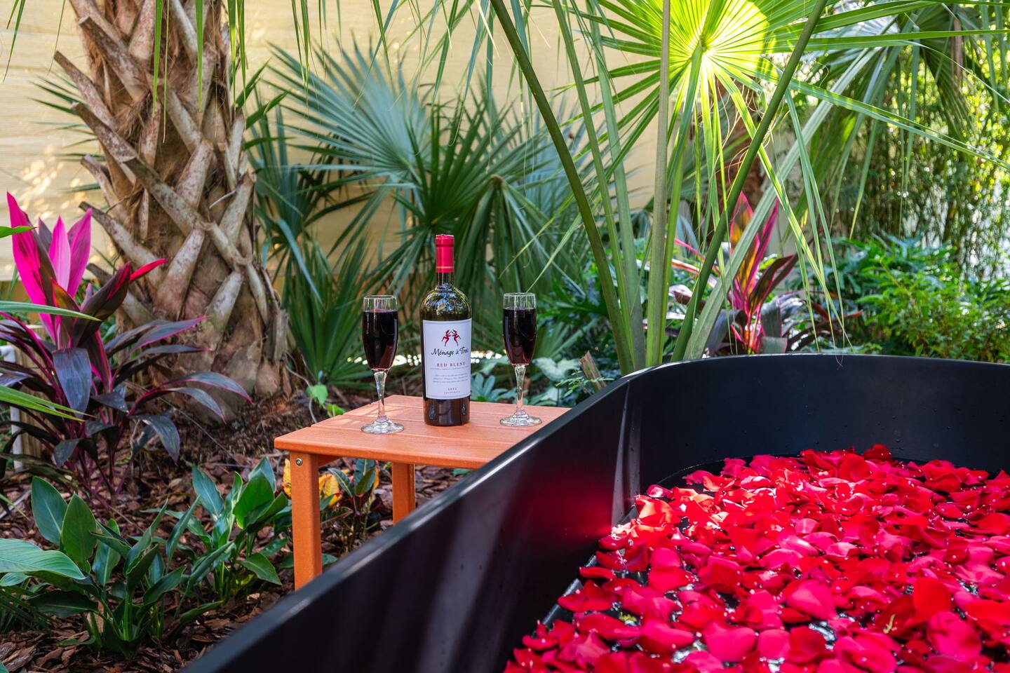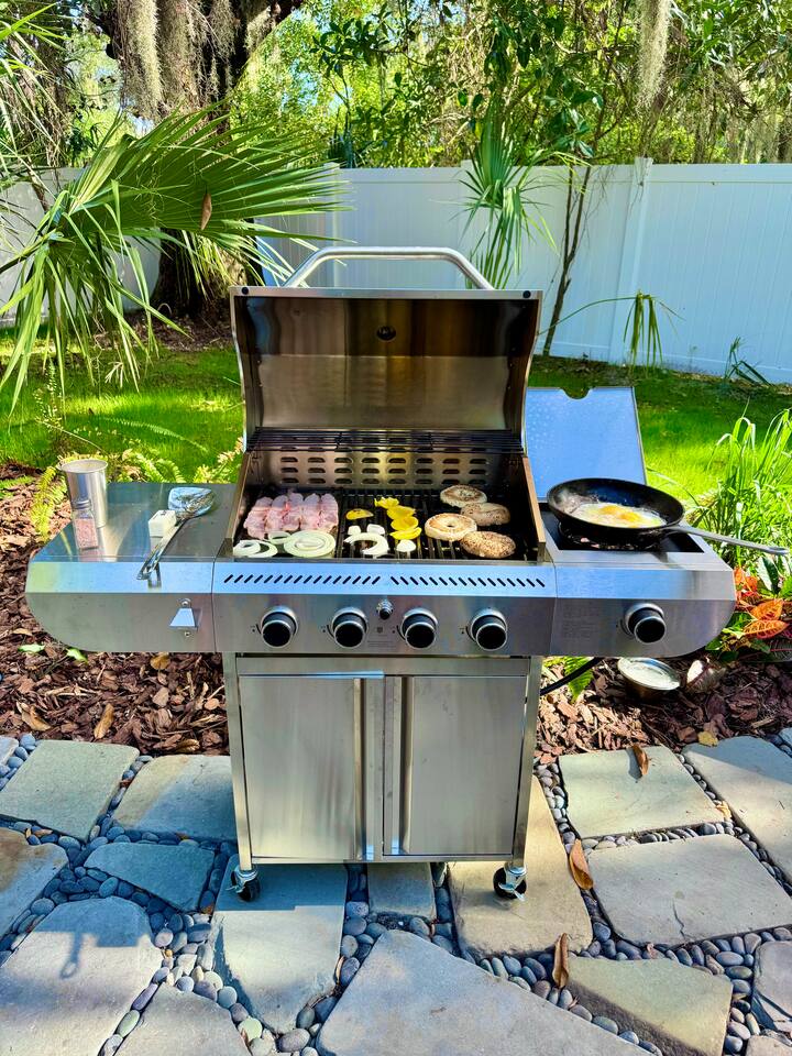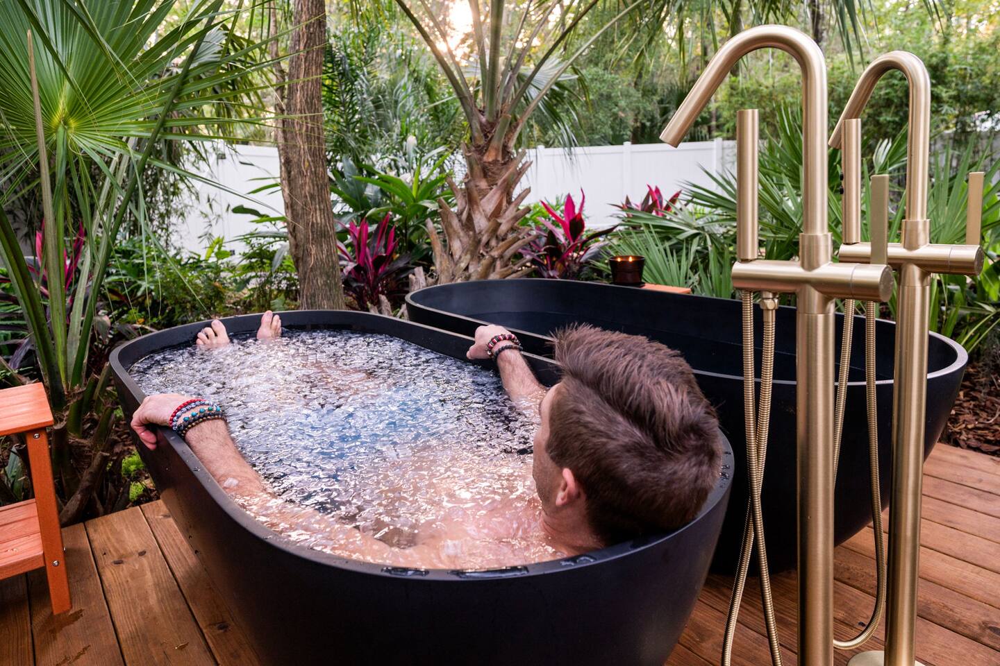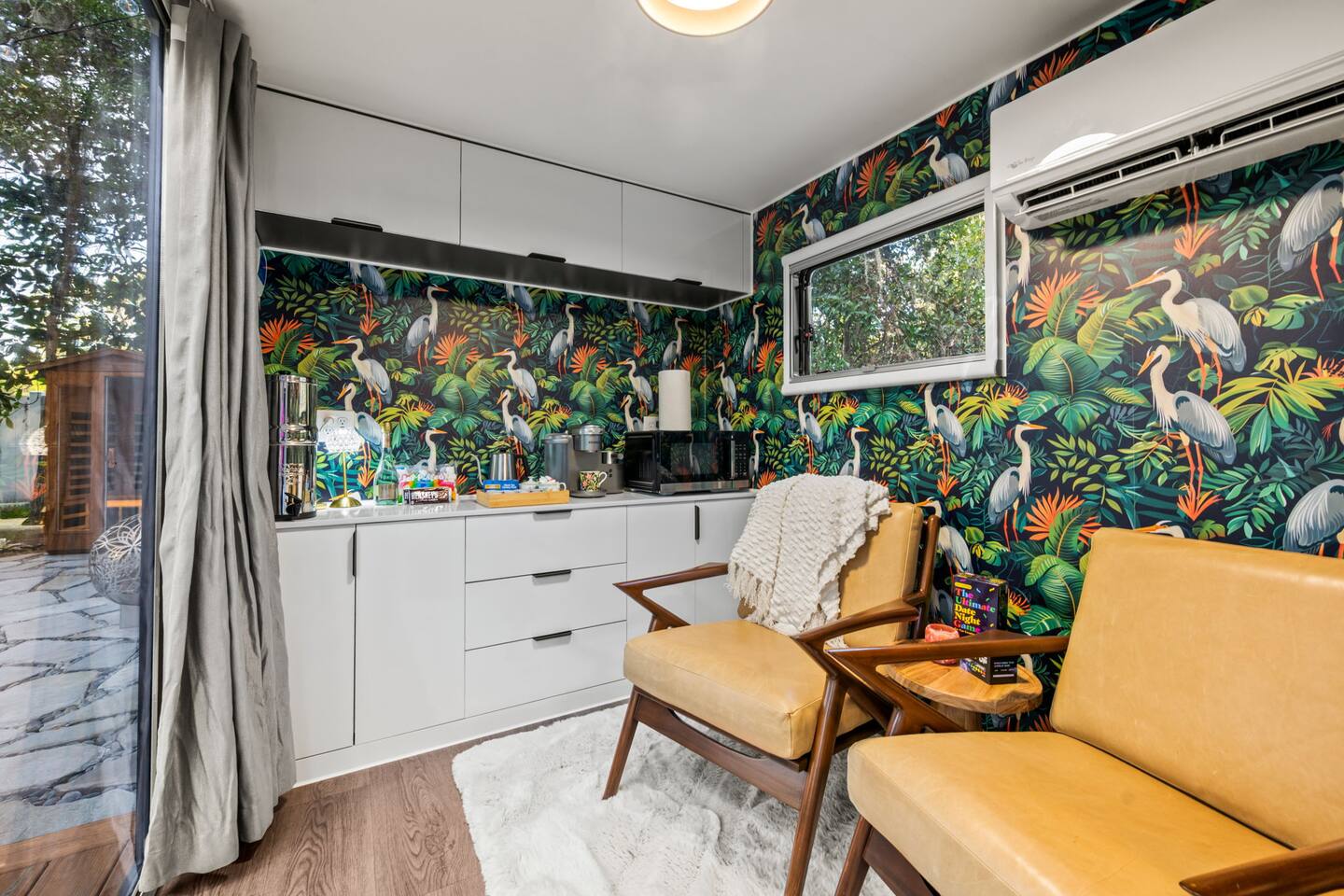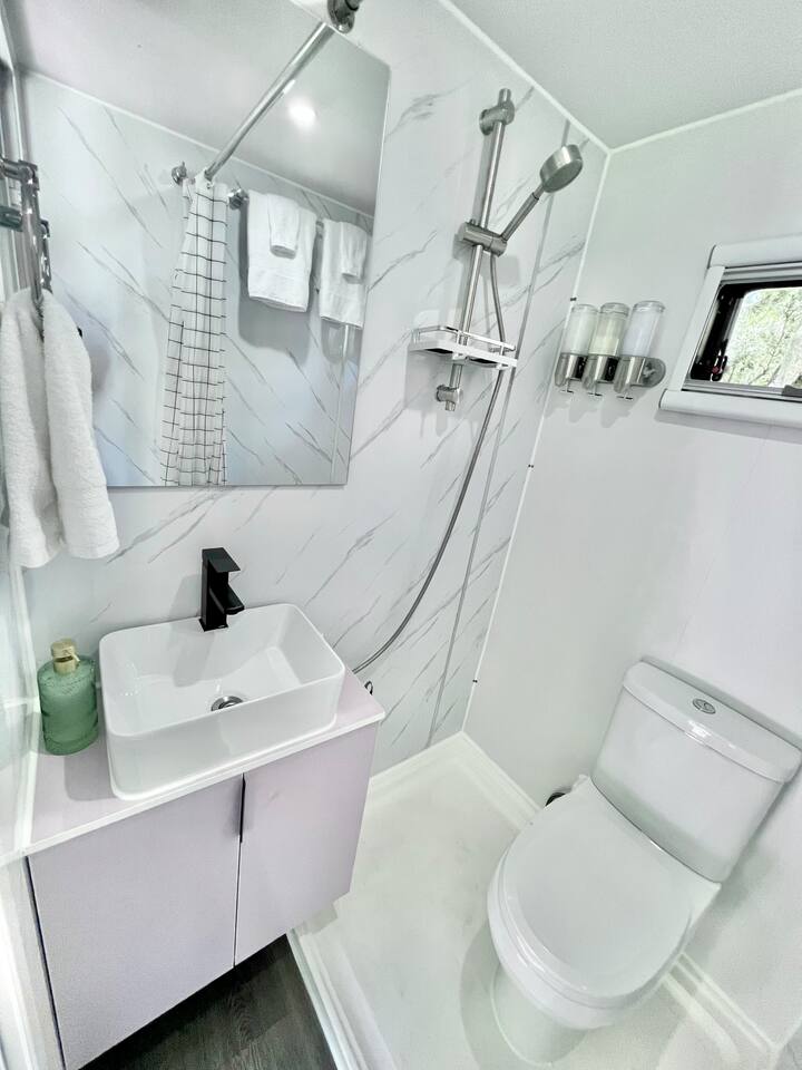 ✨ The Experience Immerse yourself in romance and relaxation beneath the stars. Enjoy two oversized outdoor soaking tubs, perfect for a hot soak or invigorating cold plunge—enhanced by a professional icemaker for wellness enthusiasts. Unwind in the private infrared sauna featuring mood lighting and a built-in sound system, or cozy up by the outdoor fire pit with a glass of wine. 🌹Deluxe Rose Package (Optional Upgrade) Please note that the rose petals and romantic rose setup you may have seen in photos or videos are not included with the nightly rate. If you’d like to elevate your stay with our Deluxe Rose Package, just let us know! We’ll be happy to add it to your reservation. Every detail is designed for connection and serenity—from plush Turkish cotton robes to romantic string lights illuminating the tropical garden. 🛏️ Inside Your Tiny Luxury Retreat Step into a beautifully designed modern interior featuring: • A cozy queen bed with luxury linens • Smart TV & Wi-Fi for streaming your favorite shows • Fully equipped kitchenette with coffee, tea, and snacks 💞 Perfect For • Romantic getaways & anniversaries • Newlyweds seeking privacy and luxury • Wellness-focused couples looking to recharge • Special occasion surprises or weekend escapes 🔑 Highlights • Two outdoor soaking tubs for hot or cold therapy • Private sauna with lights & sound system • Outdoor fire pit, hammock, & café table • Plush Turkish cotton robes for spa-like comfort • Romantic lighting & tropical garden setting • 8 minutes to Downtown St. Augustine 🍳 Your Culinary Setup: Indoor Kitchenette & Outdoor Grill You’ll have two convenient areas to accommodate all your culinary needs during your stay in Saint Augustine! The Indoor Kitchenette Our cozy indoor kitchenette is fully equipped for quick meals, snacks, and gourmet coffee. It features an all-in-one appliance: a powerful microwave/air fryer/oven that can air fry a side dish, or perfectly toast up a mean bagel. ☕️Coffee lovers, rejoice! We provide a Keurig K-Café complete with a handy milk foamer for specialty lattes and cappuccinos. Quickly heat water with the electric kettle for tea. You’ll find a selection of glassware for every comfort: cozy glass mugs for your hot drinks, sleek stainless steel glasses for water or cocktails, and elegant glass wine glasses. Best of all, we provide a Berkey water filter to ensure you always have pure, crisp drinking water on hand. The Outdoor Grilling Lounge When it's time to take the flavor outside, step out to our dedicated outdoor cooking space. It features a versatile grill with a flat griddle and a side burner—ideal for cooking up a delicious breakfast or grilling a truly perfect, juicy steak. An adjacent outdoor sink makes clean-up a breeze, and storage is provided underneath for essential pots and pans. 🚿 The Clever & Compact Wet Bath In keeping with our tiny home design, you’ll find our bathroom is a clever, space-saving wet bath—a fantastic feature for maximizing space! • Smart Design: The shower and toilet share the same waterproof pan, meaning the entire area is designed to get wet when the shower is in use. This highly efficient layout eliminates the need for a bulky separate shower stall. • Complete Amenities: The room is equipped with a modern toilet, plus a small vanity sink and mirror that are kept separate from the main shower pan area. • Heads Up: Everything inside the shower pan area will get wet when you shower! We provide a hook right outside the door for your dry towels. We love the efficiency of this unique, compact design, and we think you will too—it’s a perfect example of smart tiny living! 🌴 Location Nestled in a peaceful nature area just minutes from downtown St. Augustine, Jungle Oasis offers the best of both worlds—secluded relaxation and easy access to fine dining, beaches, and the city’s romantic charm. Book your stay at Jungle Oasis and rediscover romance in a luxurious, tropical paradise designed just for two. 💫
