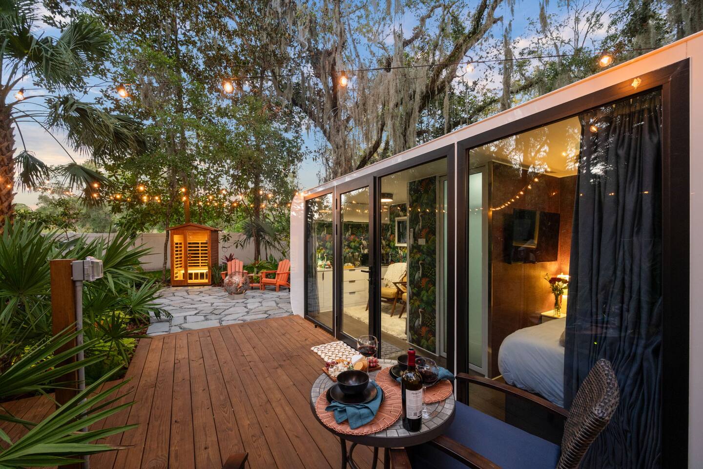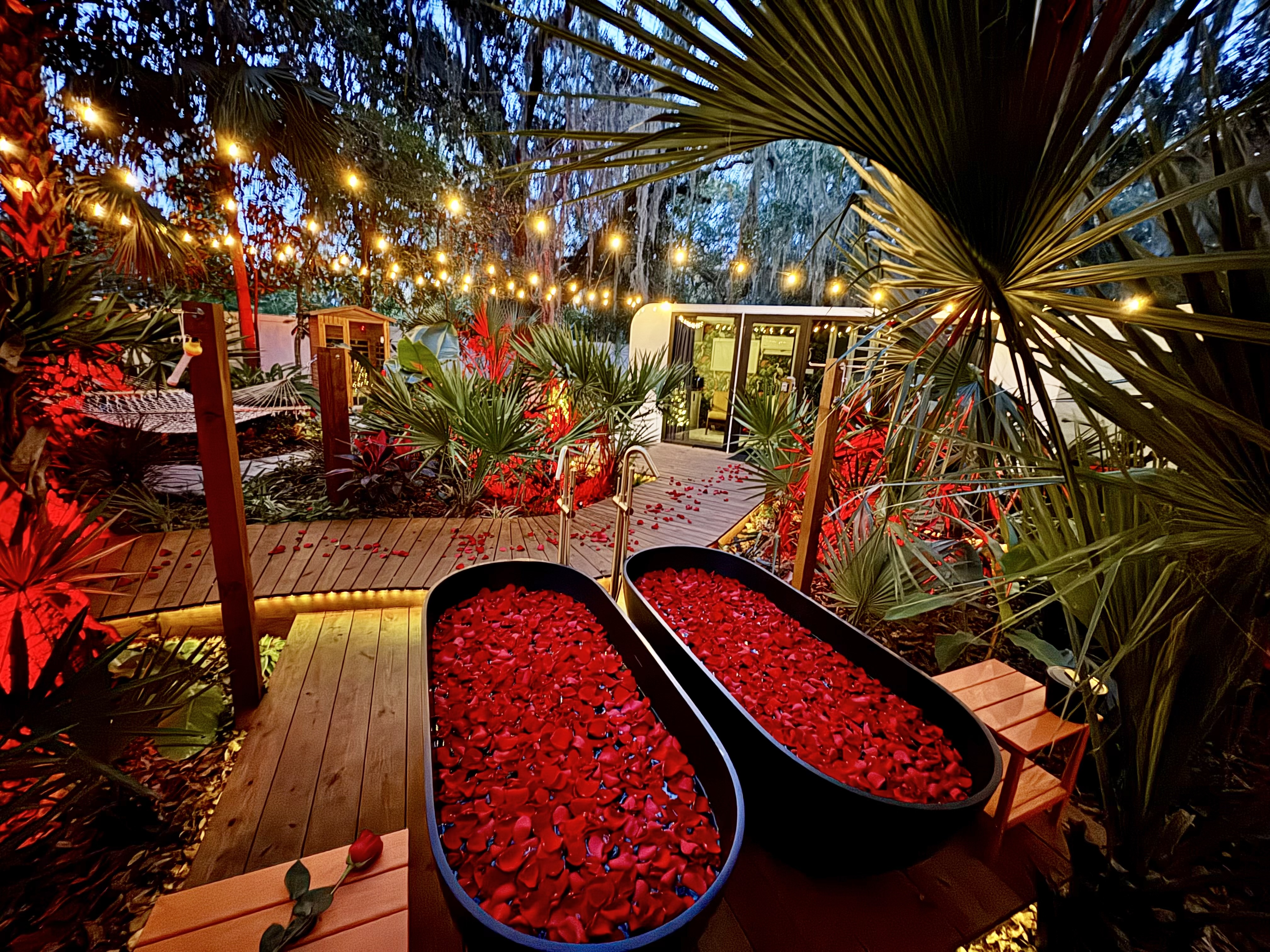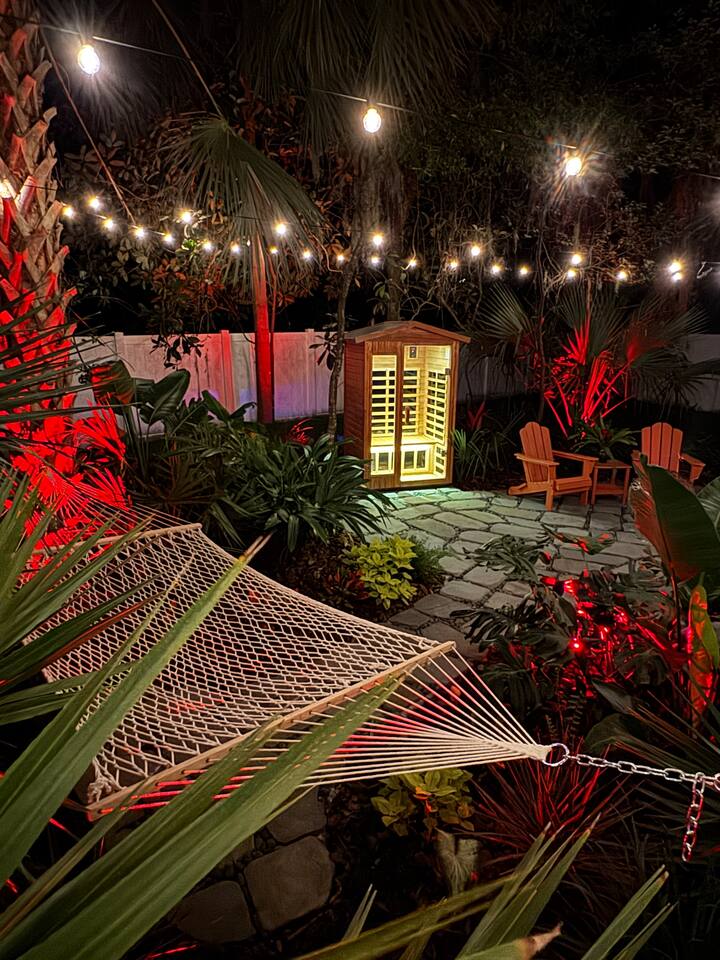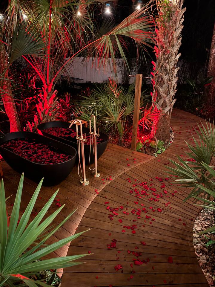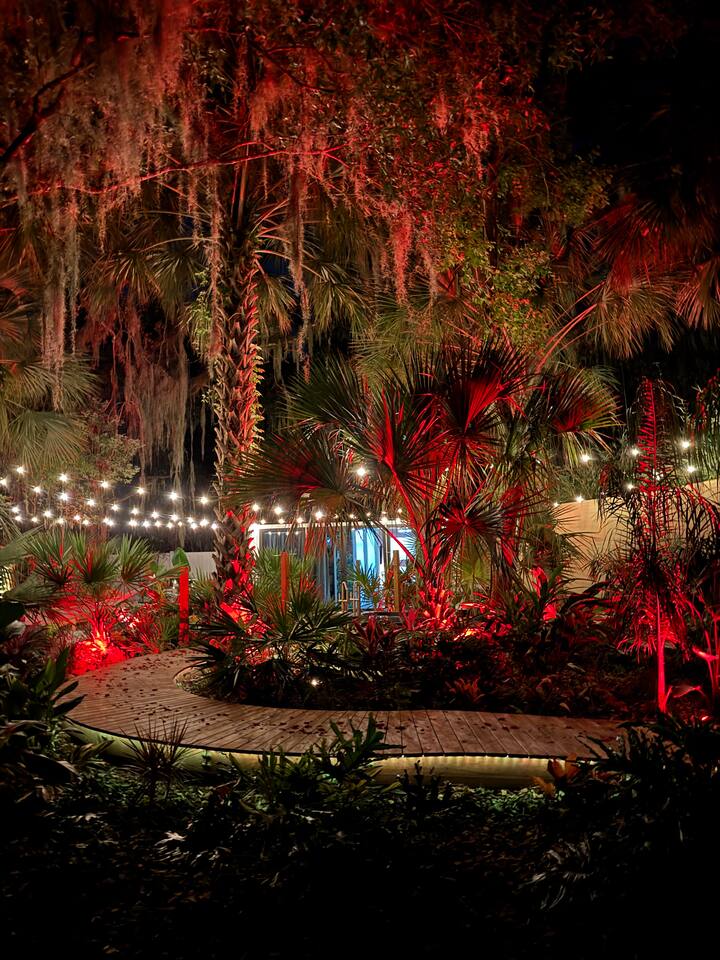 🌿 Jungle Oasis – Romantic Tiny Home Retreat with Sauna & Soaking Tubs Escape to Jungle Oasis, a one-of-a-kind romantic getaway in St. Augustine, Florida, where luxury meets tranquility. Just 8 minutes from historic downtown, this Tiny Home wellness retreat is surrounded by lush tropical landscaping and glowing ambient lights, creating an unforgettable, private sanctuary for two.✨ Upgrade to our Deluxe Rose Package🌹 if you’d like a romantic custom rose experience.
