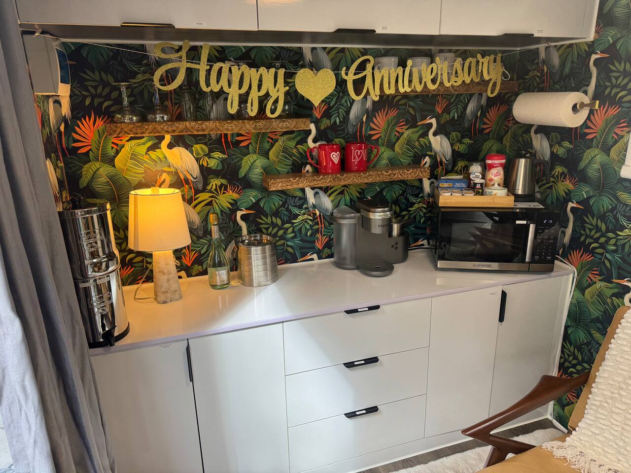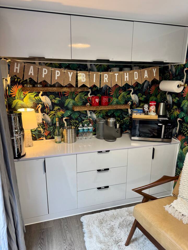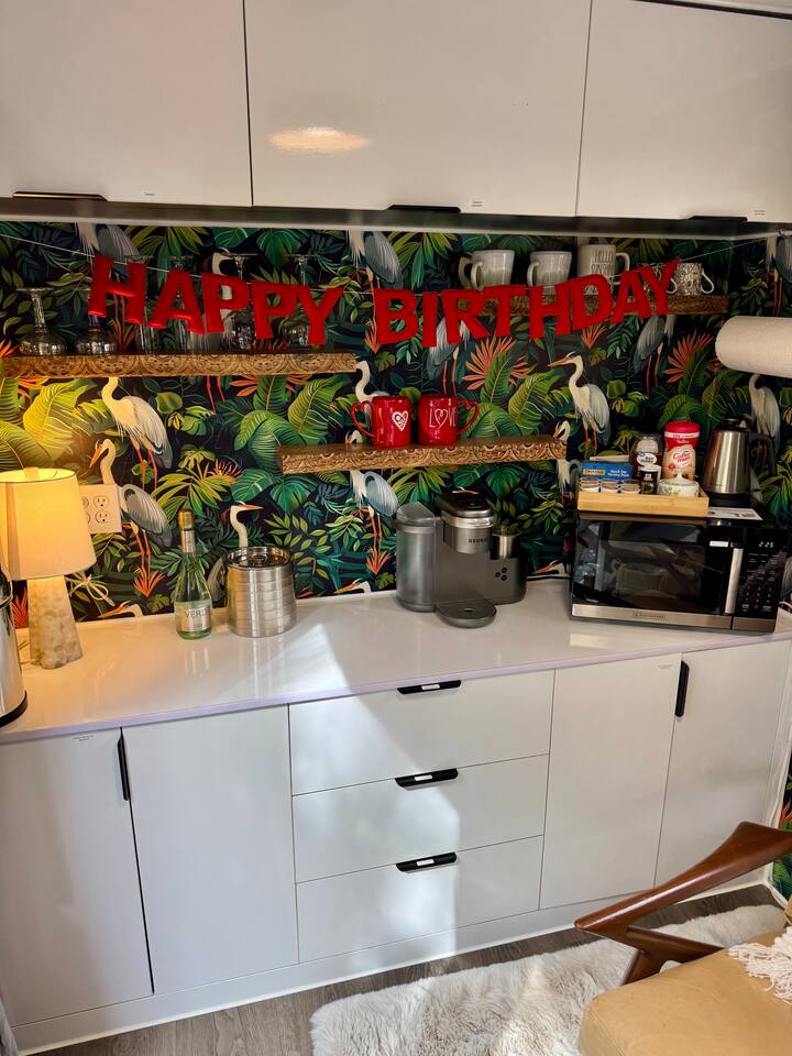⨠The Experience Immerse yourself in romance and relaxation beneath the stars. Enjoy two oversized outdoor soaking tubs, perfect for a hot soak or invigorating cold plungeâenhanced by a professional icemaker for wellness enthusiasts. Unwind in the private infrared sauna featuring mood lighting and a built-in sound system, or cozy up by the outdoor fire pit with a glass of wine. đšDeluxe Rose Package (Optional Upgrade) Please note that the rose petals and romantic rose setup you may have seen in photos or videos are not included with the nightly rate. If youâd like to elevate your stay with our Deluxe Rose Package, just let us know! Weâll be happy to add it to your reservation. Every detail is designed for connection and serenityâfrom plush Turkish cotton robes to romantic string lights illuminating the tropical garden. đď¸ Inside Your Tiny Luxury Retreat Step into a beautifully designed modern interior featuring:     â˘Â    A cozy queen bed with luxury linens     â˘Â    Smart TV & Wi-Fi for streaming your favorite shows     â˘Â    Fully equipped kitchenette with coffee, tea, and snacks     đ Perfect For     â˘Â    Romantic getaways & anniversaries     â˘Â    Newlyweds seeking privacy and luxury     â˘Â    Wellness-focused couples looking to recharge     â˘Â    Special occasion surprises or weekend escapes đ Highlights     â˘Â    Two outdoor soaking tubs for hot or cold therapy     â˘Â    Private sauna with lights & sound system     â˘Â    Outdoor fire pit, hammock, & cafĂŠ table     â˘Â    Plush Turkish cotton robes for spa-like comfort     â˘Â    Romantic lighting & tropical garden setting     â˘Â    8 minutes to Downtown St. Augustine đł Your Culinary Setup: Indoor Kitchenette & Outdoor Grill Youâll have two convenient areas to accommodate all your culinary needs during your stay in Saint Augustine! The Indoor Kitchenette Our cozy indoor kitchenette is fully equipped for quick meals, snacks, and gourmet coffee. It features an all-in-one appliance: a powerful microwave/air fryer/oven that can air fry a side dish, or perfectly toast up a mean bagel. âď¸Coffee lovers, rejoice! We provide a Keurig K-CafĂŠ complete with a handy milk foamer for specialty lattes and cappuccinos. Quickly heat water with the electric kettle for tea. Youâll find a selection of glassware for every comfort: cozy glass mugs for your hot drinks, sleek stainless steel glasses for water or cocktails, and elegant glass wine glasses. Best of all, we provide a Berkey water filter to ensure you always have pure, crisp drinking water on hand. The Outdoor Grilling Lounge When it's time to take the flavor outside, step out to our dedicated outdoor cooking space. It features a versatile grill with a flat griddle and a side burnerâideal for cooking up a delicious breakfast or grilling a truly perfect, juicy steak. An adjacent outdoor sink makes clean-up a breeze, and storage is provided underneath for essential pots and pans. đż The Clever & Compact Wet Bath In keeping with our tiny home design, youâll find our bathroom is a clever, space-saving wet bathâa fantastic feature for maximizing space! ⢠Smart Design: The shower and toilet share the same waterproof pan, meaning the entire area is designed to get wet when the shower is in use. This highly efficient layout eliminates the need for a bulky separate shower stall. ⢠Complete Amenities: The room is equipped with a modern toilet, plus a small vanity sink and mirror that are kept separate from the main shower pan area. ⢠Heads Up: Everything inside the shower pan area will get wet when you shower! We provide a hook right outside the door for your dry towels. We love the efficiency of this unique, compact design, and we think you will tooâitâs a perfect example of smart tiny living! đ´ Location Nestled in a peaceful nature area just minutes from downtown St. Augustine, Jungle Oasis offers the best of both worldsâsecluded relaxation and easy access to fine dining, beaches, and the cityâs romantic charm. Book your stay at Jungle Oasis and rediscover romance in a luxurious, tropical paradise designed just for two. đŤ